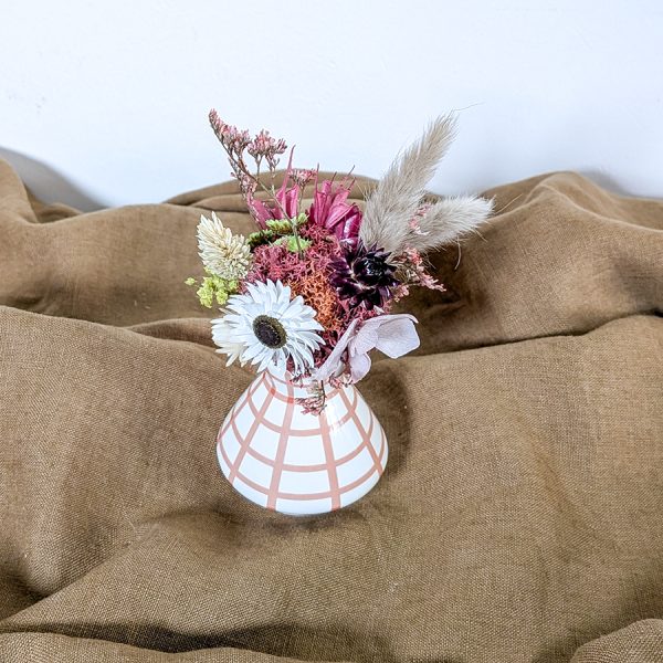 Los mini candelabros están hechos con mezcla de materiales secos, preservadas y frescos, aunque estos últimos están elegidos para que también sequen correctamente. Con el paso del tiempo, puede haber ligeros cambios de tono o color en ciertos verdes o flores propios de la naturaleza.